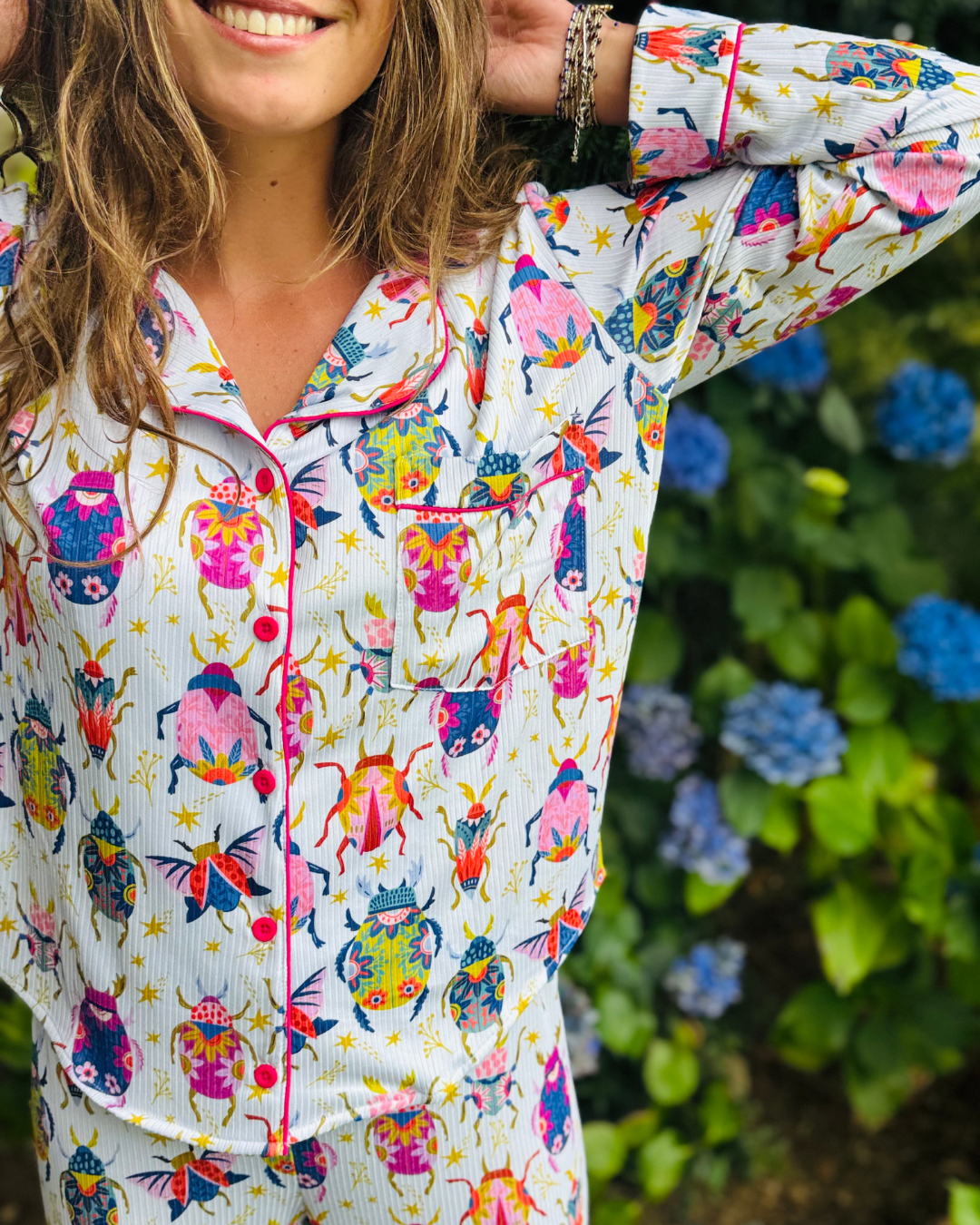 Nuestro Pijama Beetles en tela rib combina lo mejor del estilo y la comodidad. Su textura acanalada abraza al cuerpo con suavidad mientras su diseño de escarabajos de colores sobre un fondo celeste lo hace alegre y único